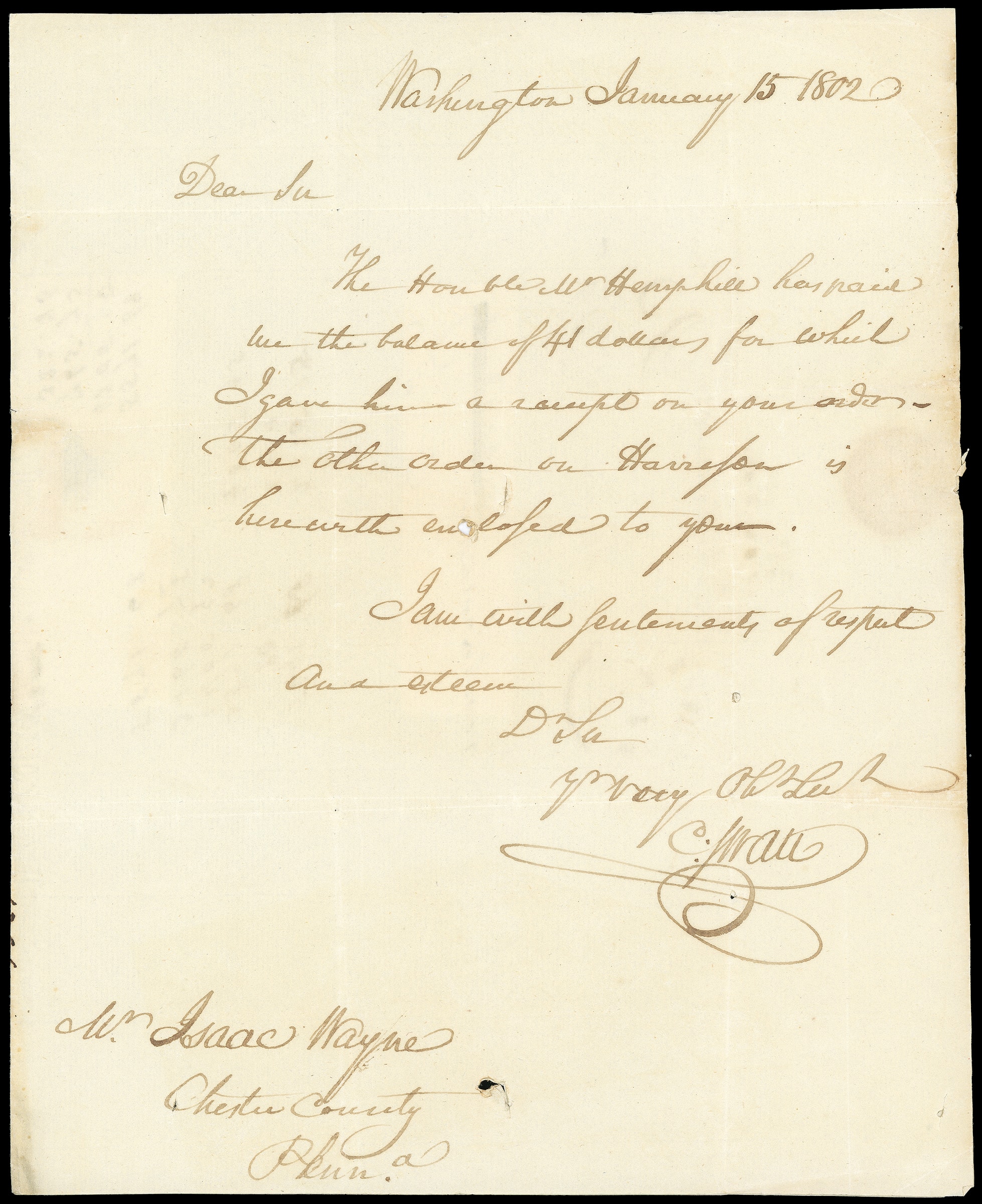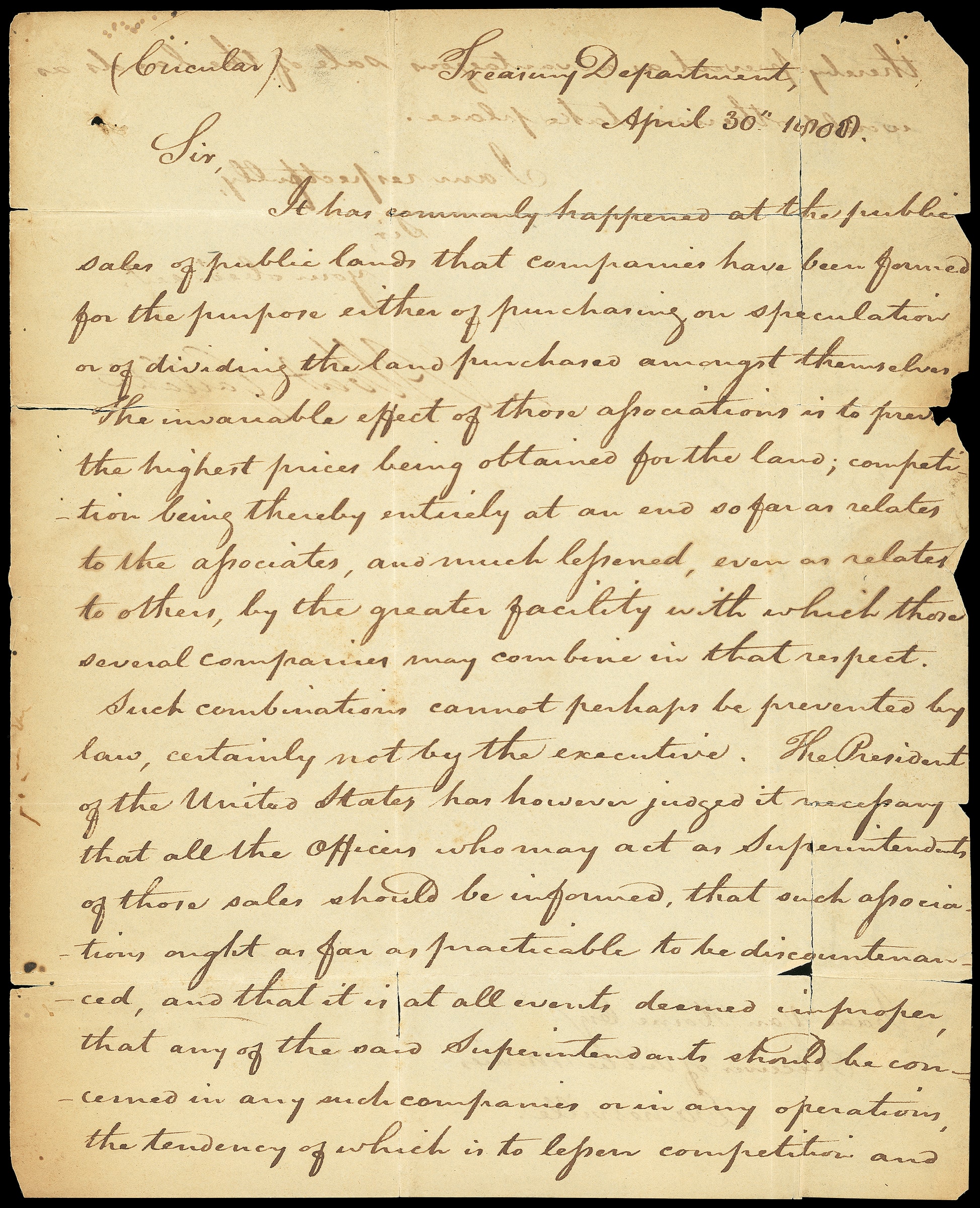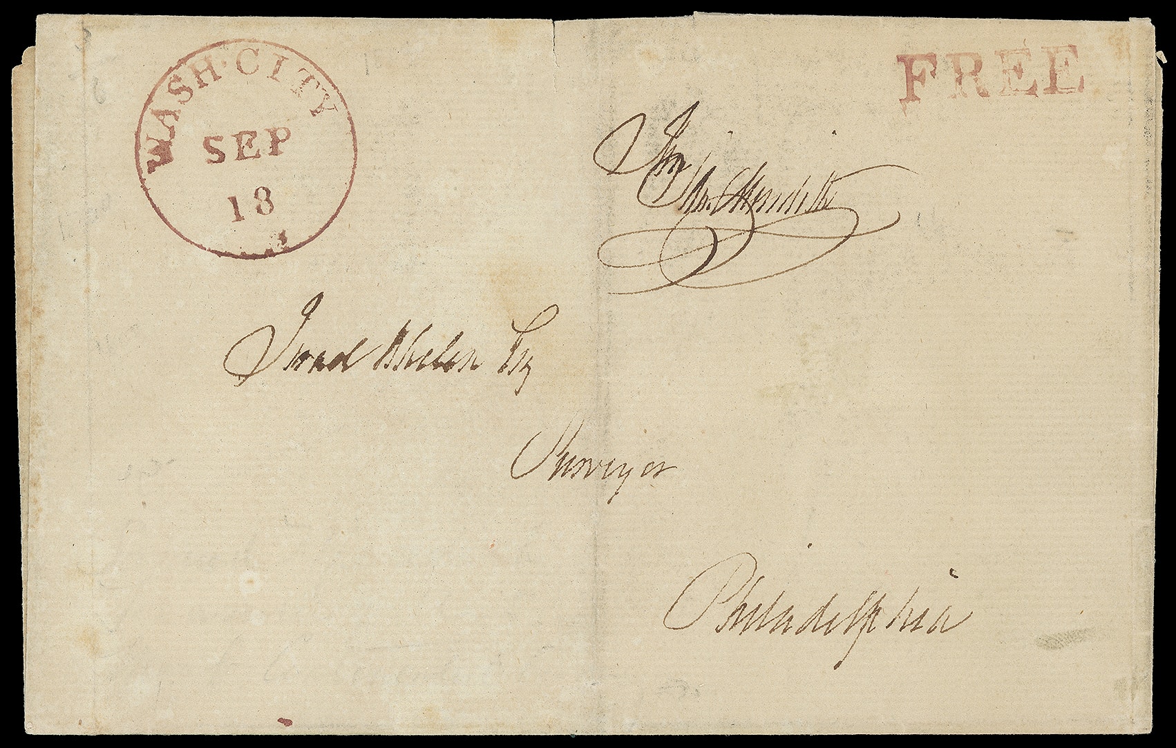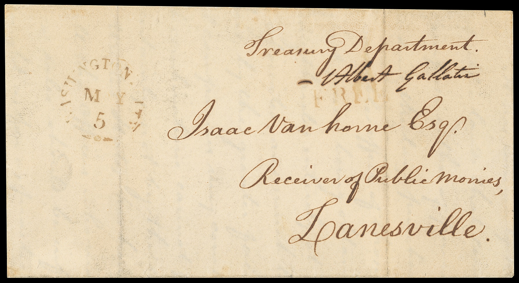 23       image(Secretary of the Treasury) Albert Gallatin. 1808 folded letter free franked "Albert Gallatin" and endorsed "Treasury Department at top right, entered mails with "Washington City, May 5" cds and matching "Free" handstamp to Receiver of Public Monies, Zanesville, Ohio, handwritten dated circular concerning the abuse by companies formed to purchase public lands; leafs split, Fine, ex-Parker.