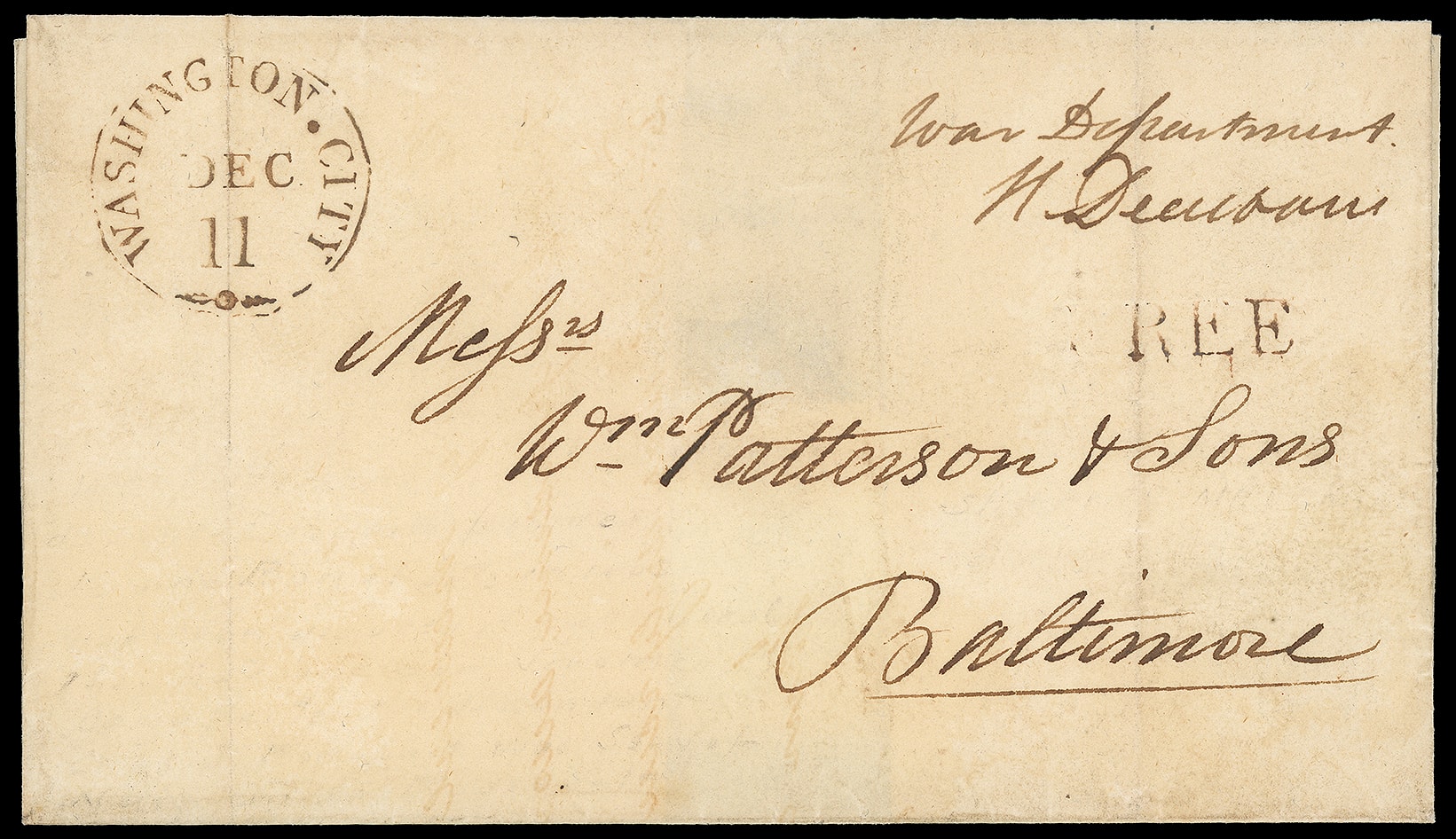 24       image(Secretary of War) Henry Dearborn. Secretary of War (1801-1809). 1807 folded cover with "War Department, H Dearborn" free frank entering mails with sharp "Washington. City, Dec 11" cds and "Free" rating handstamp to Columbia S.C.; file folds, Very Fine.