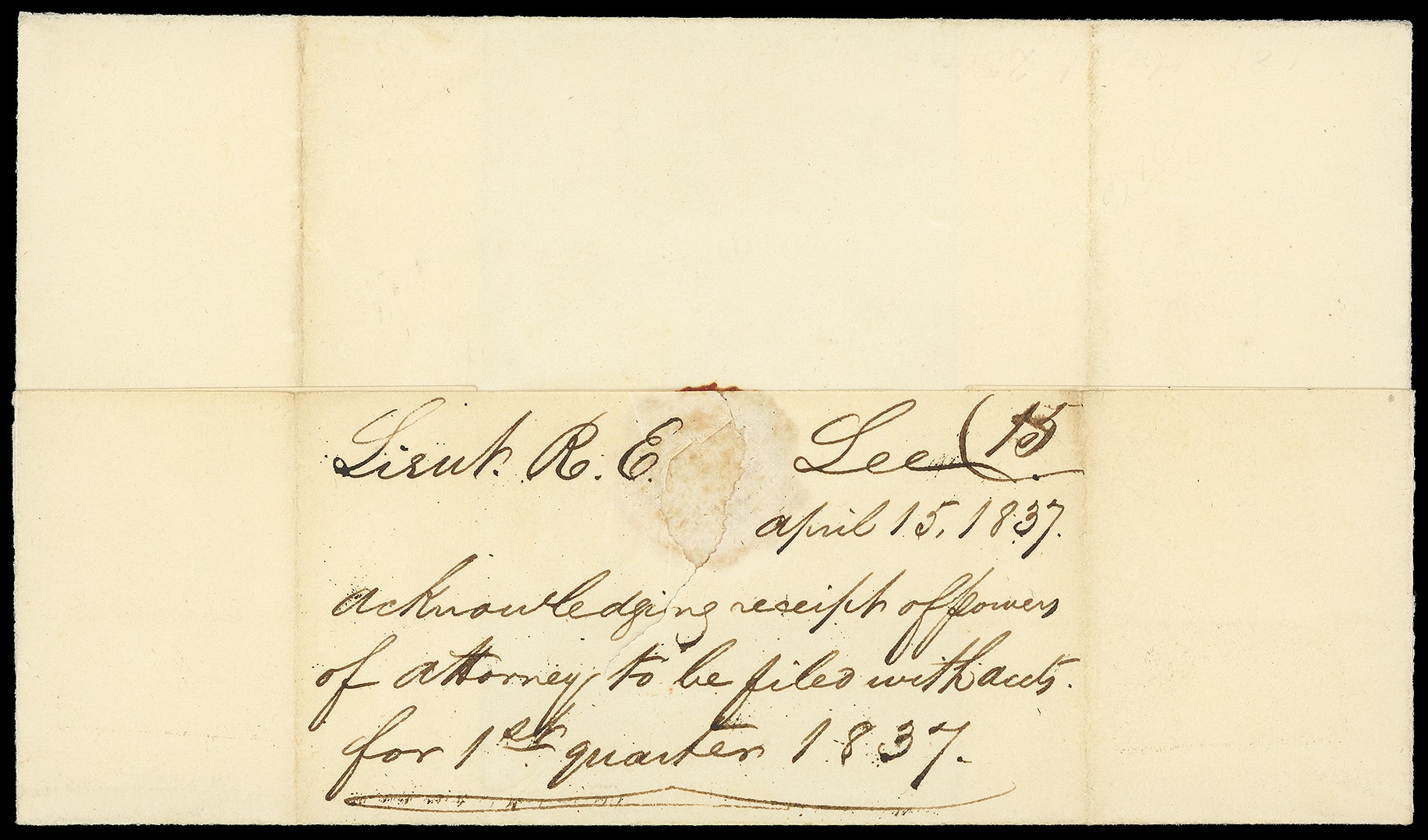 This cover was franked early in Robert E. Lee's career as a U.S. Army officer. After graduating from West Point in 1829, Lee served in various engineering assignments before he was posted to the chief engineer's office in Washington D.C., from 1834-37. This letter was written near the end of that assignment. Shortly afterward he was assigned to supervise the engineering works for the St. Louis harbor and the upper Mississippi and Missouri rivers.