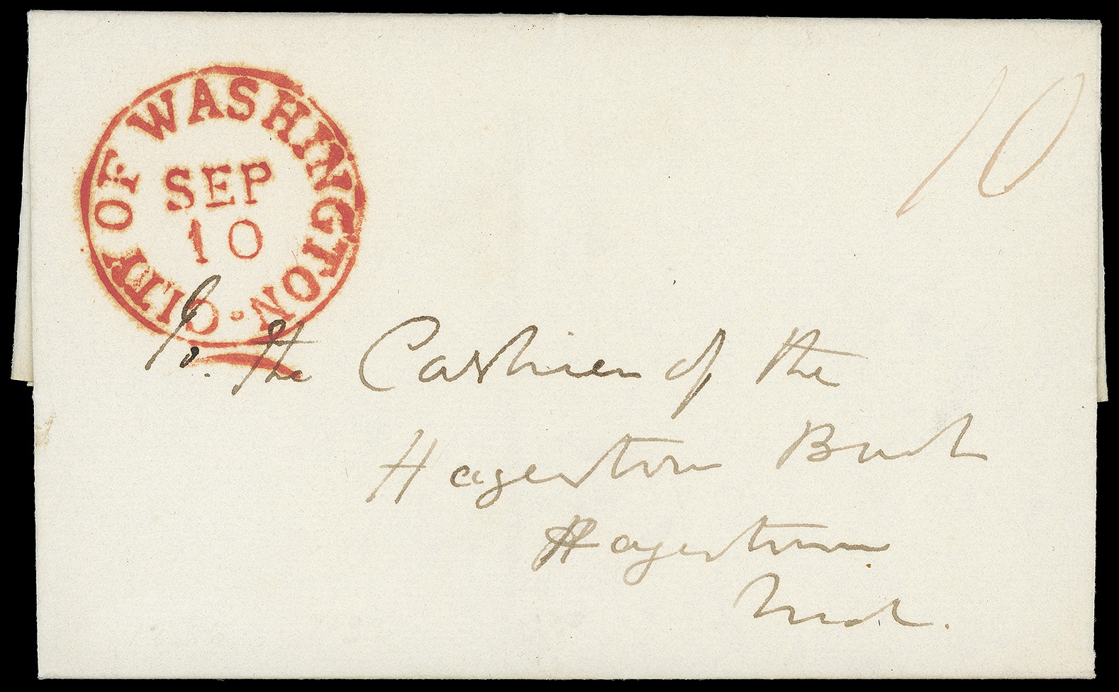 40       image1856 (Sep. 10) Washington, D.C. to Hagerstown, Md. Folded letter with intense red "City of Washington, Sep 10" cds and ms. "10" rating, fresh and Extremely Fine gem.