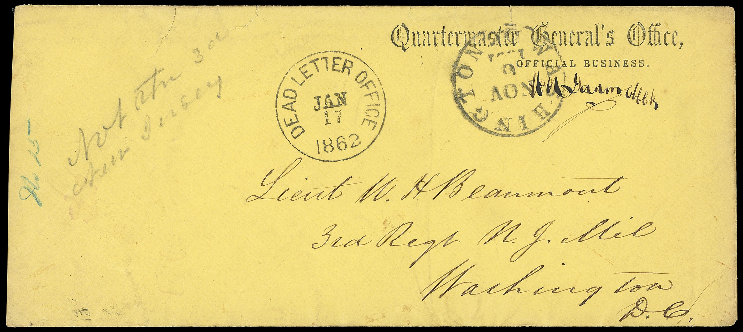 29       image1861 (Nov. 6) Washington D.C. to local address, forwarded to Dead Letter Office. Legal-size Quartermaster General's Office free franked envelope with "Washington D.C. Nov 6, 1861" cds addressed to Lieut. W.H. Beaumont, 3rd Regt N.J. Mil., Washington D.C., pencil "Not at 3d New Jersey" note, bold "Dead Letter Office, Jan 17, 1862" cds, docketed "Property account examined and sent to 3d auditor for settlement" on reverse; top edge tears, Very Fine, ex-Turner.
