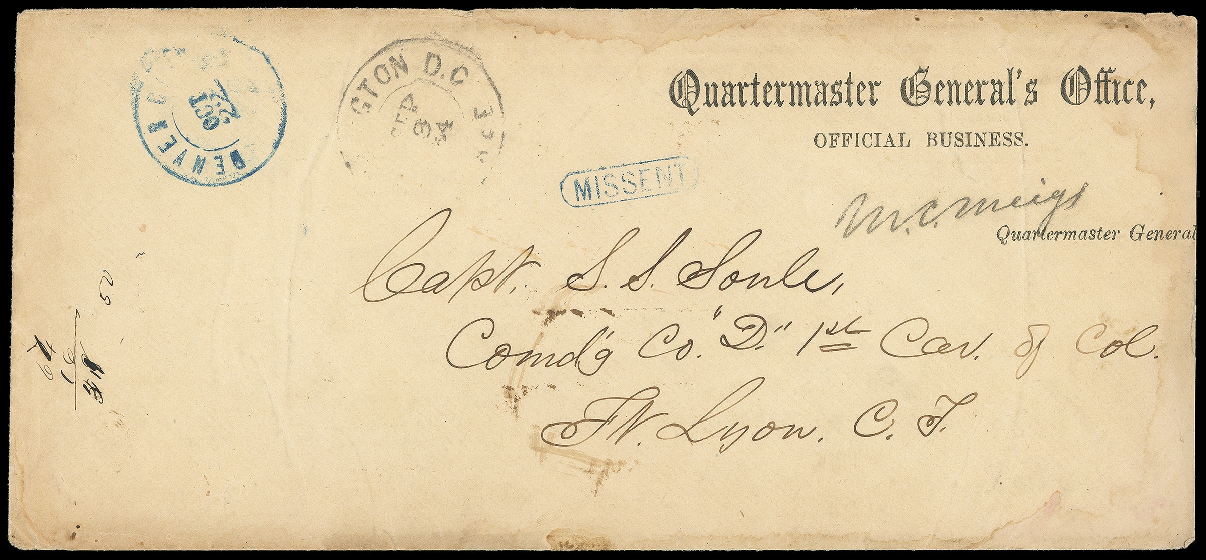 30 *      image(War) Montgomery C. Meigs. Free frank handstamp, entered mails with partial "Washington D.C 'Free' Sep 3 '64" cds on Quartermaster General's Office imprint cover to Capt. S.S. Soule, Comd'g Co. "D", 1st Cav. of Col, Fort Lyon, Colorado Territory, blue "Denver City, Oct 22" cds with matching "Missent" framed handstamp; slight stains, reduced slightly at right, F.-V.F. and scarce Denver missent use.