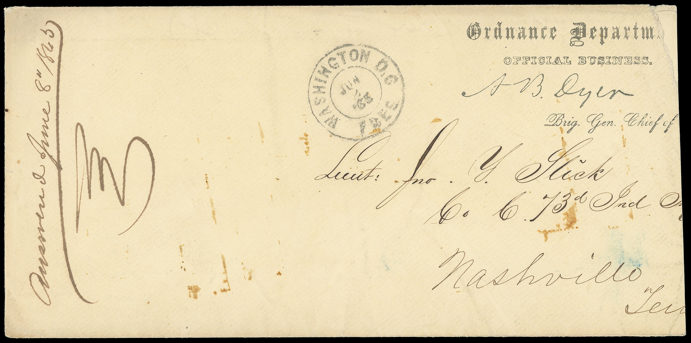 28       image(War) Alexander Byrdie Dyer. 1815-1874. Ordnance Department imprint with printed "A.B. Dyer" free frank on buff cover with "Washington D.C., Free, Jun 2 '65" cds to Nashville Tenn., reverse with overall drawing in blue and black with maze home; reduced slightly at right, F.-V.F.