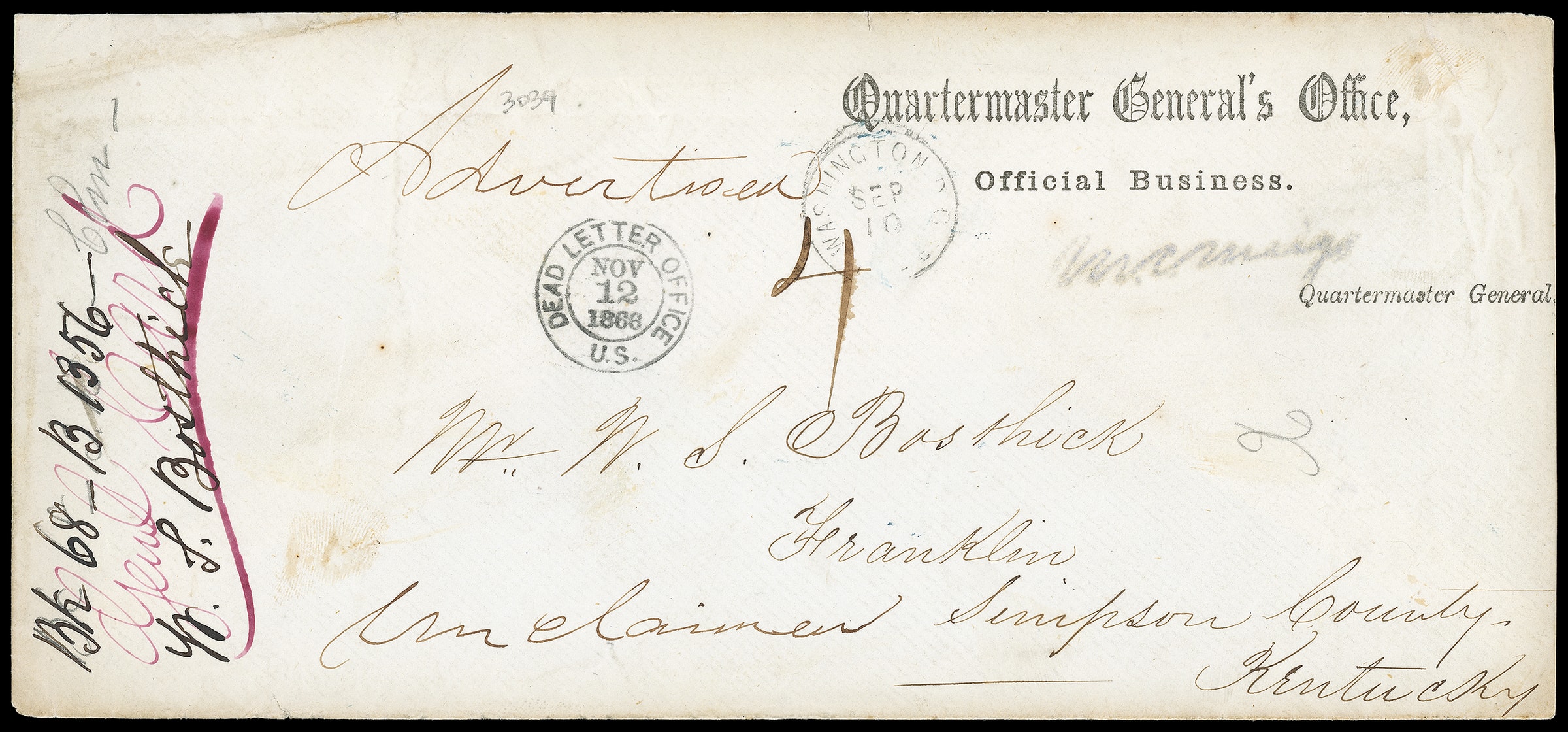 31       image(War) Montgomery C. Meigs. Free frank handstamp with "Washington D.C Sep 10" cds on Quartermaster General's Office imprint cover to Franklin, Kentucky, manuscript "Advertised", "Unclaimed" and "4" cent, bold "Dead Letter Office, U.S. Nov 12, 1866" double-circle datestamp; some wrinkling, F.-V.F.