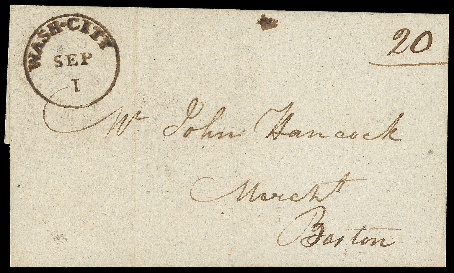 38       image1799 (Sep. 1) Alexandria, Va. to Boston, Mass. via Washington D.C. Docketed folded cover with boldly struck "Wash-City Sep 1" cds in brownish black with manuscript "20" rating addressed to John Hancock in Boston Ma., docketed from Alexandria via the post, Extremely Fine early strike of the first Federally-issued cds.