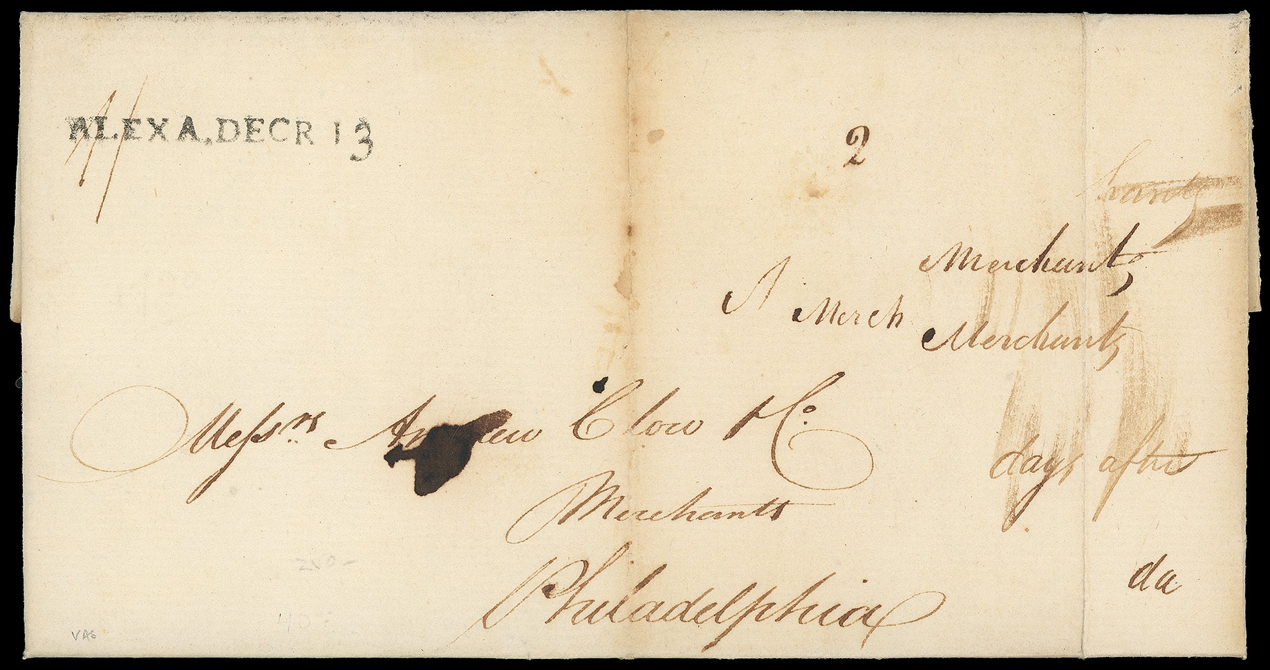 34       image1790 (Dec. 13) Alexandria, D.C. to Philadelphia Pa. Folded letter with sharp "ALEXA. DECR 13" straightline and "2" rating, Philadelphia "1/" local currency rating; some fold toning, minor docketing on face, Very Fine strike.
