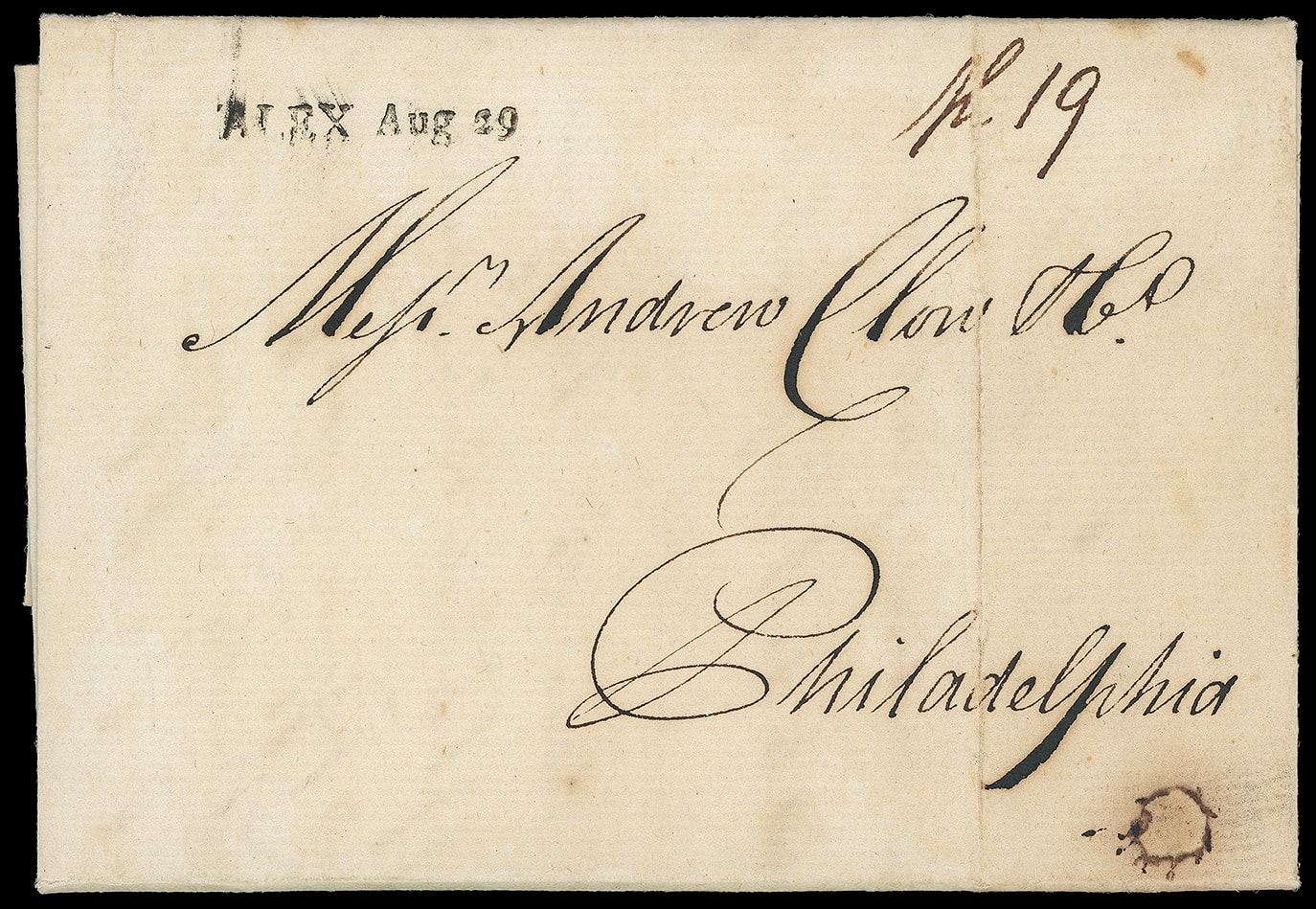 35       image1793 (Jul. 15) Cadiz, Spain to Philadelphia Pa. via Alexandria Ship. Datelined folded letter with "ALEX Aug 29" straightline and ms. "Sh 19" ship rating, letter concerning shipments with some interesting content "…advice from Italy that the Crops in Sciily & other states are exceedingly abundant & that very strict prohibition has been issued to prevent any being sent to France. They had a mind to do it they cannot as very large English & Spanish Fleet are cruising in the Mediterranean who have block'd up in a manner all the French ports thereabouts…"; file fold through rating, erosion hole, Fine and scarce early Alexandria ship letter.