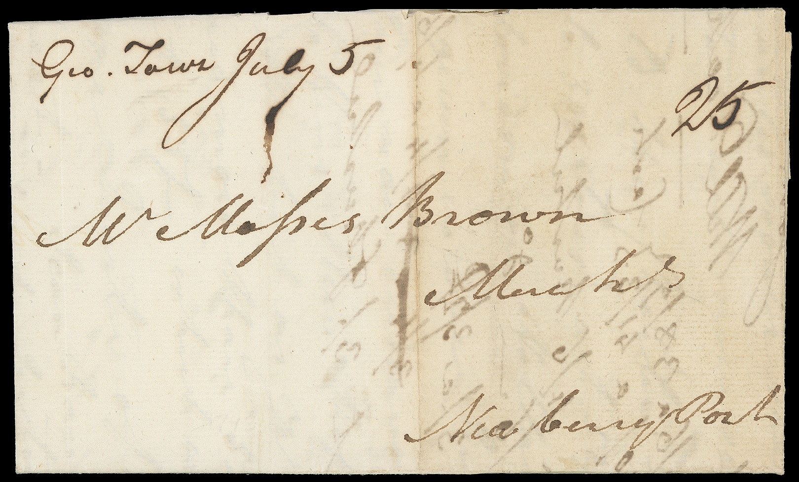 36       image1793 (Jul. 5) Georgetown, D.C. to Newburyport, Mass. Datelined folded letter with "Geo. Town July 5" manuscript postmark with matching "25" cent rating on 1793 folded letter to Newburyport Mass.; light right half toning, F.-V.F.
