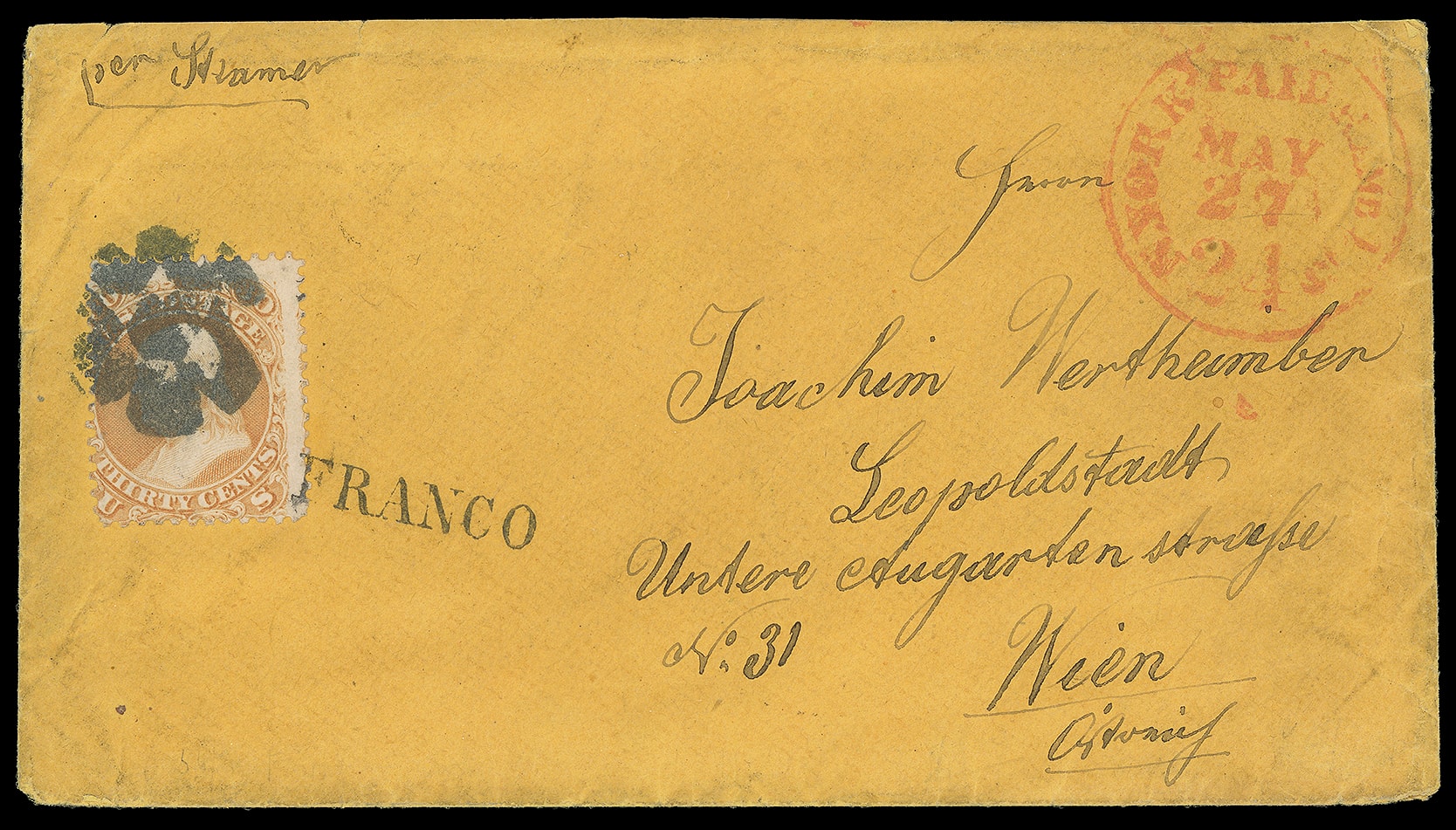 8th, Hamburg (6.8) backstamp and sharp "Franco" also ties 30¢, Vienna (6.14) arrival backstamp; edge wear, small part of flap missing, Very Fine. Kirke No. 65-05-20-SGEO; Estimate $300 - 400. (Image1)