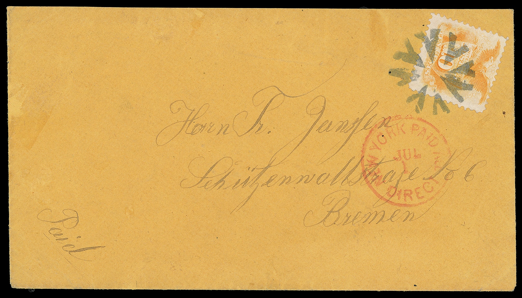 Carets. Sharp strike ties 10¢ orange (116), red "New York, Paid All, Direct, Jul 1" exchange cds on orange cover to Bremen, Germany, July 13th arrival backstamp, Very Fine. Kirke No. 68-06-17-WG; Estimate $300 - 400.