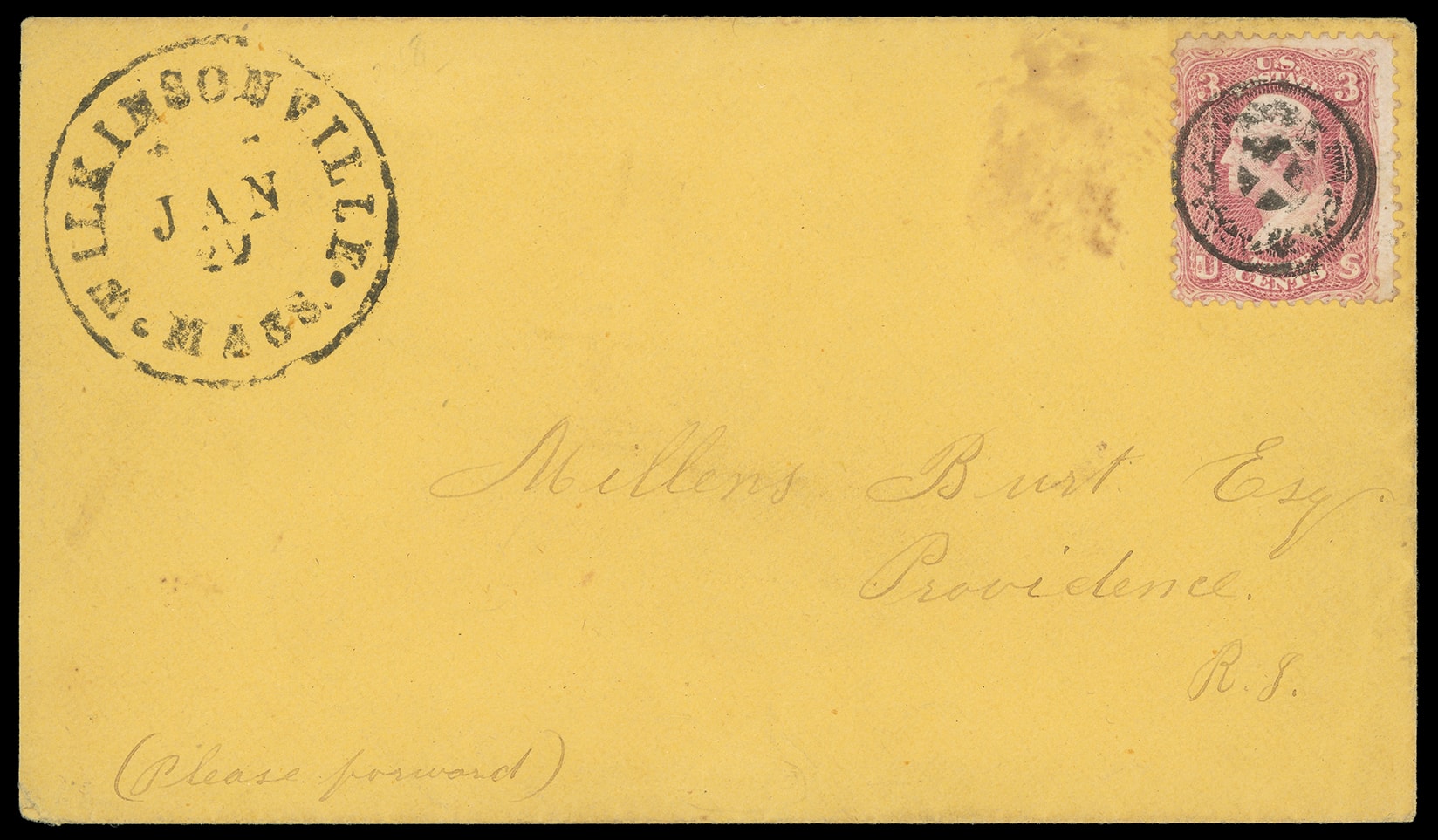 Shield. Bold strike of fancy cancel includes a central quartered pie shape surrounded by wreath and a shield at top, ties 3¢ rose (65), matching "Wilkinsonville Mass. Jan 29" balloon-style cds on orange cover to Providence R.I.;