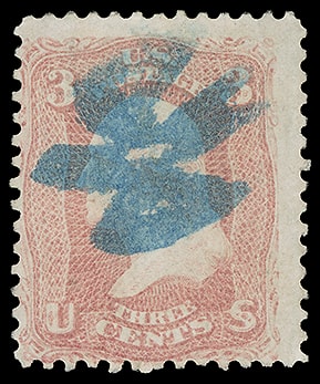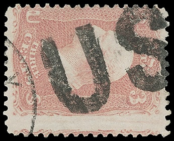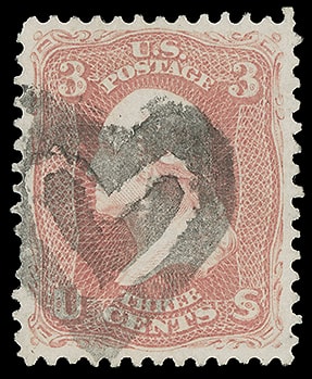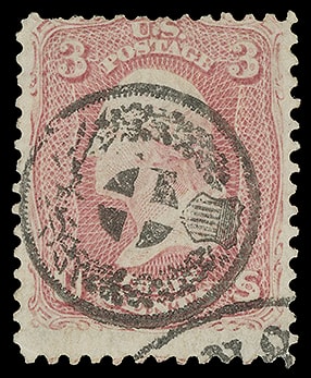 Rockford Ill., bold socked-on-the-nose strike cancels 3¢ rose (65), bright and fresh, Very Fine and choice strike. Skinner-Eno No. PA-B 18; Estimate $200 - 300.