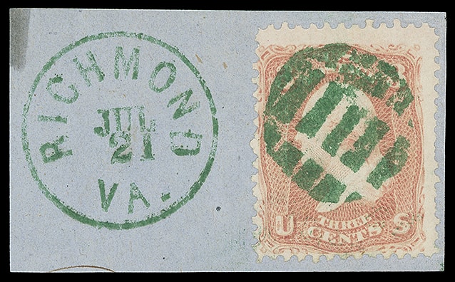 Intense vibrant grid strike duplexed with "Richmond Va. Jul 21" cds ties 3¢ rose (65), short perf, on small blue piece; small tape stain top left, Very Fine and striking. Estimate; $150 - 200. (Image1)
