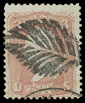 "Elm Leaf" fancy cancel. Bold strike cancels 3¢ rose (65), partial cds at left, Very Fine strike, Rarity RR. Rohloff No. L-1; Estimate $200 - 300.