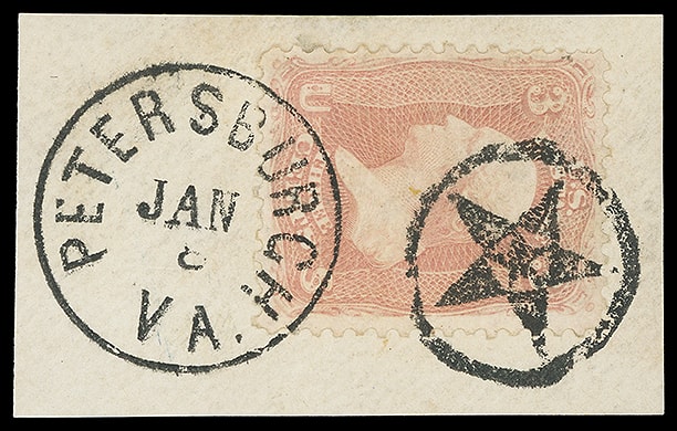 within Star. Bold strike duplexed with "Petersburg Va. Jan 8" ties 3¢ rose (65) on small piece, fresh and Extremely Fine. Skinner-Eno No. ST-St 21; Estimate $150 - 200.