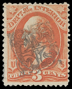 Points. Intricate rubberized cancel on 2¢ Interior (O98), flaws, Very Fine strike. Estimate; $75 - 100. (Image1)