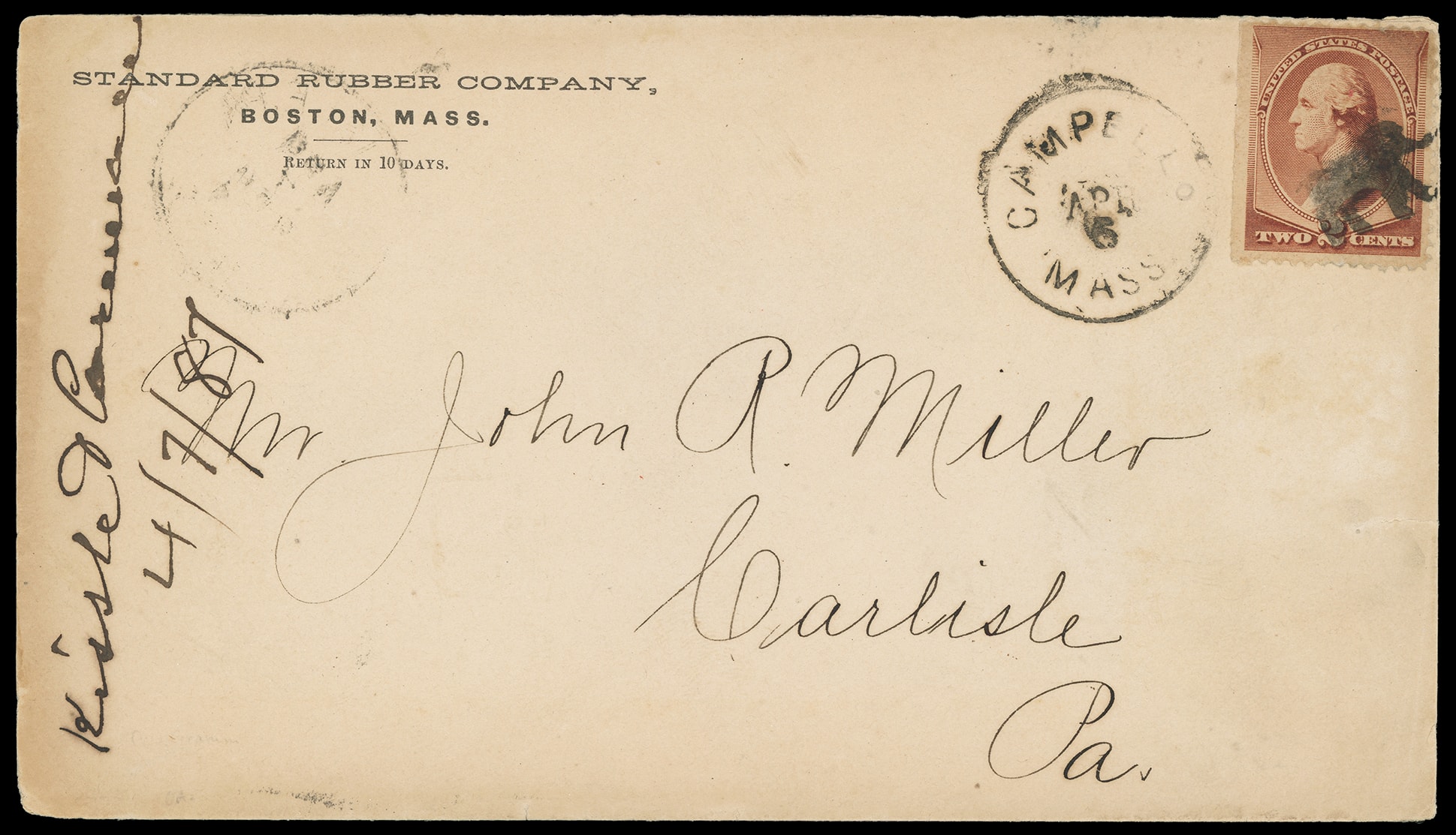 Clear strike duplexed with "Campello, Mass. Apr 6" cds ties 2¢ red brown (210), nat. s.e. at left, on buff Standard Rubber Co. corner card cover to Carlisle Pa., 1887 docketing at left; hint of tone, Very Fine and rare pictoral fancy