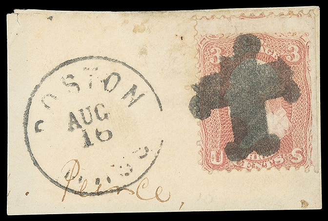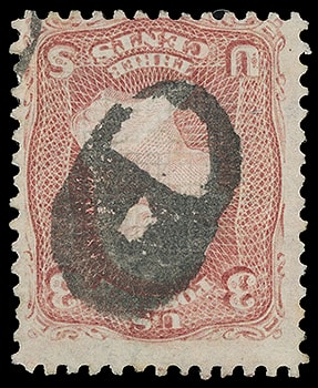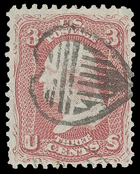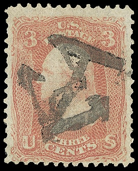 Intense bold strike cancels 3¢ rose (65), short perf at top, Extremely Fine strike. Skinner-Eno No. PA-H 3; Estimate $150 - 200. (Image1)