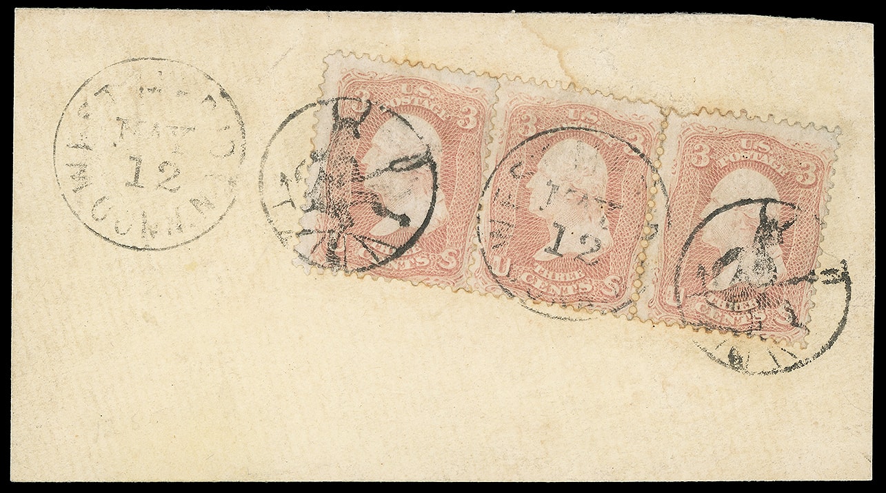 Bridgeport Ct., neat strike with partial cds cancels 3¢ rose (65), perf tear at left, Very Fine and choice strike. Skinner-Eno No. PH-H 60; Estimate $150 - 200.