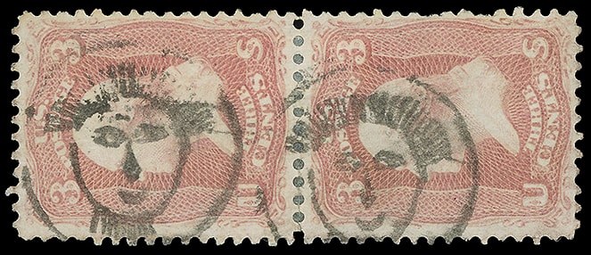 Circle. Of Columbus Wisc., two clear strikes cancel 3¢ rose (65) vertical pair, reinforced separation, couple short perfs, Very Fine strikes. Skinner-Eno No. PH-M 8; Estimate $200 - 300. (Image1)