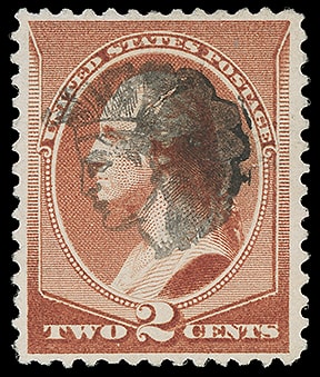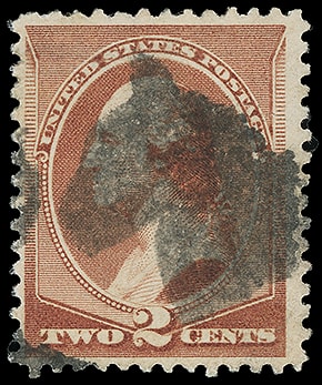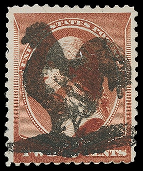 Sharp socked-on-the-nose strike cancels 2¢ red brown (210), wide margins, Very Fine. Cole No. JO-161; Estimate $150 - 200. (Image1)