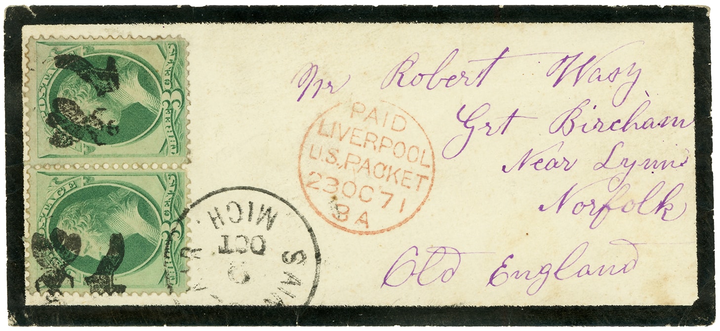 Sharp bold strikes duplexed with "Saint Clair, Mich. 2 Oct" cds cancel 3¢ green (147) horizontal pair on 1871 mourning cover to Lynn, England, partial Oct. 25 arrival backstamp, Very Fine, ex-Knapp, Emerson, with 1990 P.F.
