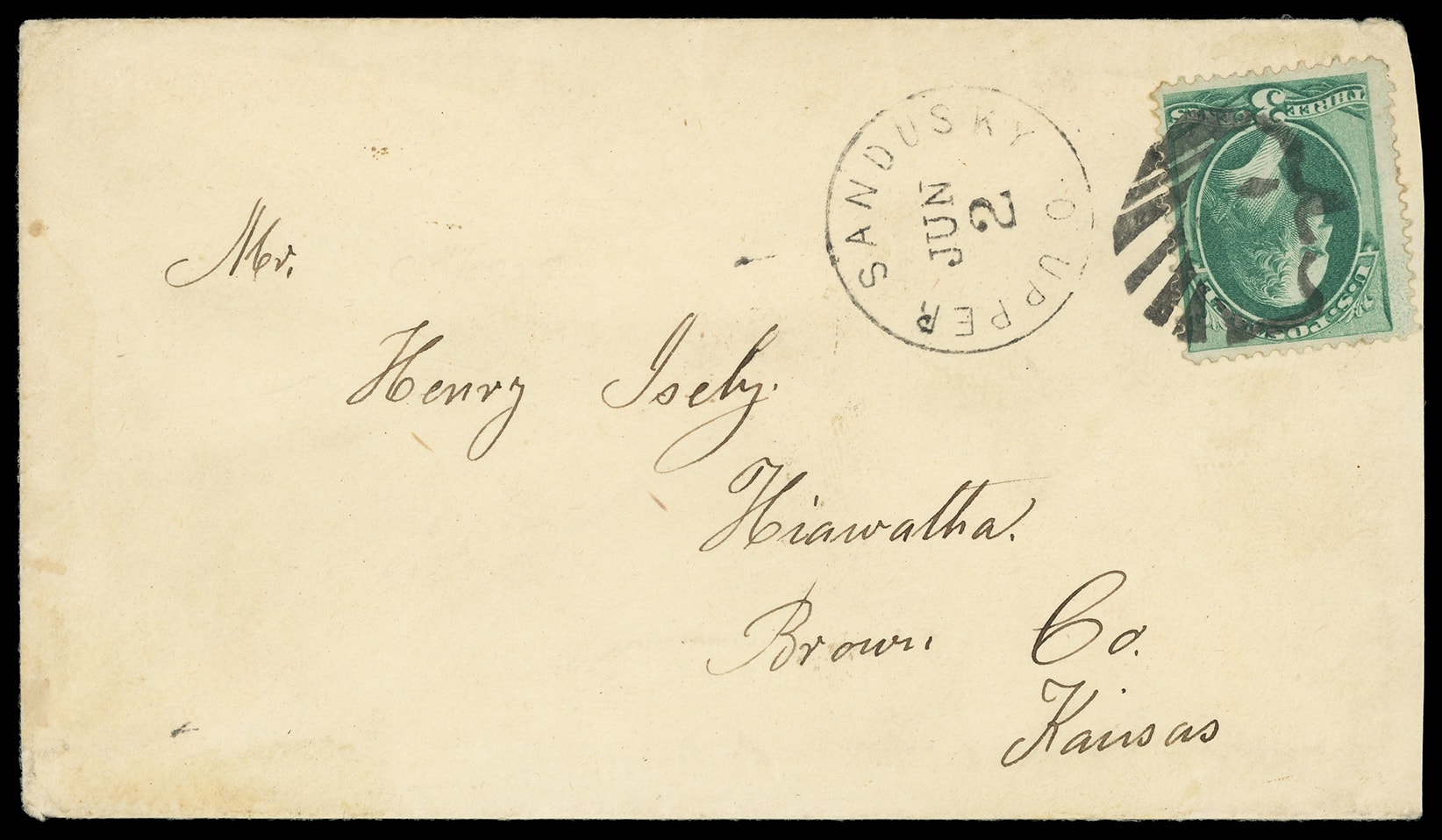 Perfect strike duplexed with "Upper Sandusky, O. Jun 2" cds ties 3¢ green (158) on amber cover to Hiawatha Kans., June 5th 1875 receipt docketing on reverse; reduced slightly at right, Very Fine and choice strike of this rare fancy