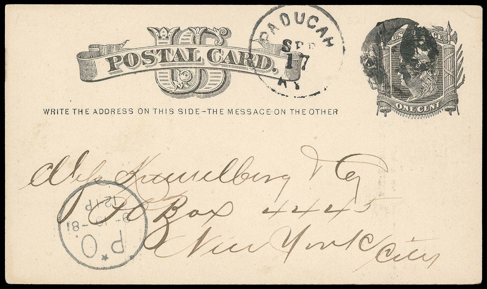 and Star. Negative cancel duplexed with "Paducah Ky. Sep 17" cds on 1¢ postal card to New York City, 1881 arrival cds, F.-V.F. Whitfield No. 21; Estimate $150 - 200. (Image1)