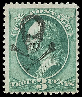 Cross-Bones. Sharp strike cancels 3¢ green (207), small flaw top right, Very Fine and sharp strike. Whitfield No. 165. Cole No. SK-37; Estimate $75 - 100.