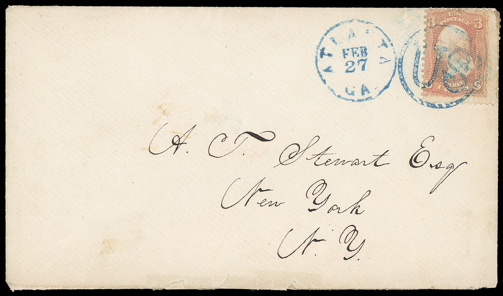 Circle. Blue strike duplexed with "Atlanta Ga. Feb 27" cds ties 3¢ rose (65), toned corner, on 1867 cover to New York City, original 1867 datelined enclosure; small bottom edge and 3¢ flaws, Very Fine strike of this Georgia