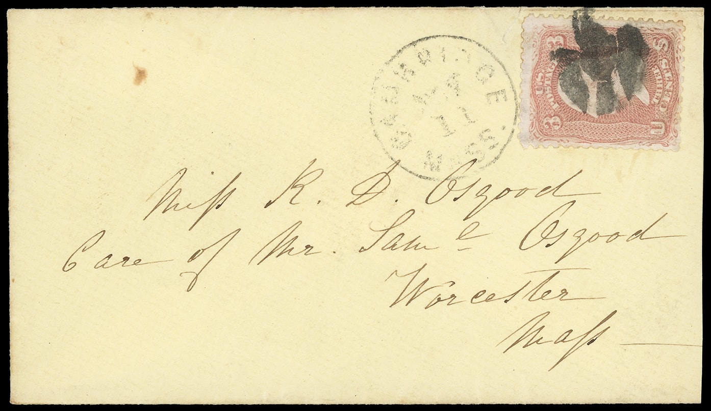 strike duplexed with "Cambridge Mass. Nov 11" cds ties 3¢ rose (65) on light yellow cover to Worcester Mass.; tiny tone spot, Very Fine strike, ex-Dr. Robertson, Erivan. Skinner-Eno No. PA-B 23a var.; Estimate $200 - 300.