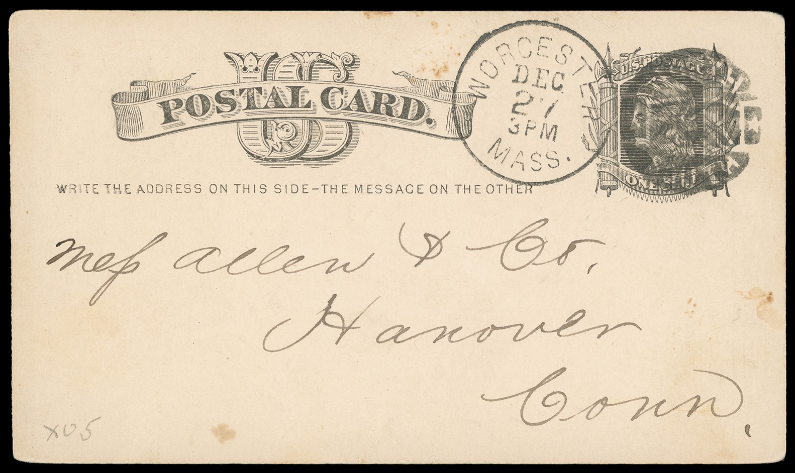 Negative Handshake of Worcester, Mass. Clear strike with handshake clearly visible duplexed with "Worcester Mass., Dec 27" cds on 1¢ postal card (UX5) to Hanover, Conn., message side with printed ad for Mason Brush Works; couple tone spots,