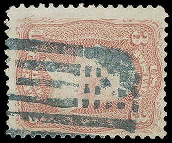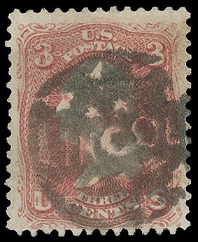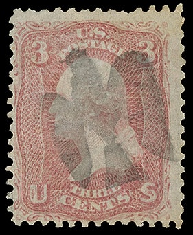 Whitehall N.Y., blue strike cancels 3¢ rose (65); light creasing, fresh and Very Fine strike of this patriotic cancel. Skinner-Eno No. PT-F 26; Estimate $150 - 200.