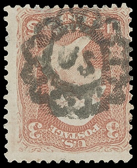 Compass with positive "G". Intense strike cancels 3¢ rose (65), rich color, an Extremely Fine strike. Skinner-Eno No. FR-M2a 9; Estimate $150 - 200.