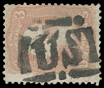 Frame. Bold strike cancels 3¢ rose (65), trivial corner perf crease, an Extremely Fine strike. Skinner-Eno No. PT-C 23; Estimate $200 - 300.