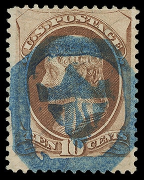 Octagonal Frame. Of Chicago Ill., perfect bold blue strike cancels 10¢ brown (150), Extremely Fine strike. Cole No. SH-113; Estimate $150 - 200.