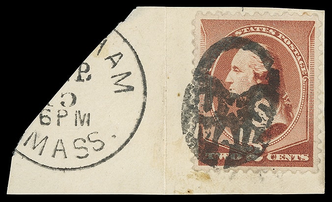 Padlock. Complete strike duplexed with partial "Stoneham Mass., Feb 15" cds ties 2¢ red brown (210) on small piece; vertical crease to left of stamp, Very Fine strike. Cole No. LCK-3; Estimate $300 - 400. (Image1)