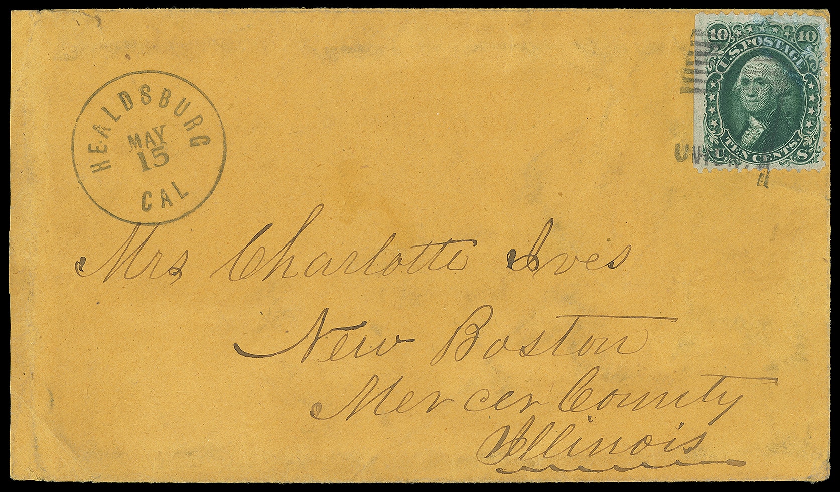Flag. Clear strike of fancy cancel ties 10¢ green (68), corner repaired, matching "Healdsburg Cal. May 15" cds on orange cover to New Boston Ill.; stamp repaired at top right, Very Fine appearance. Estimate; $750 - 1,000. (Image1)