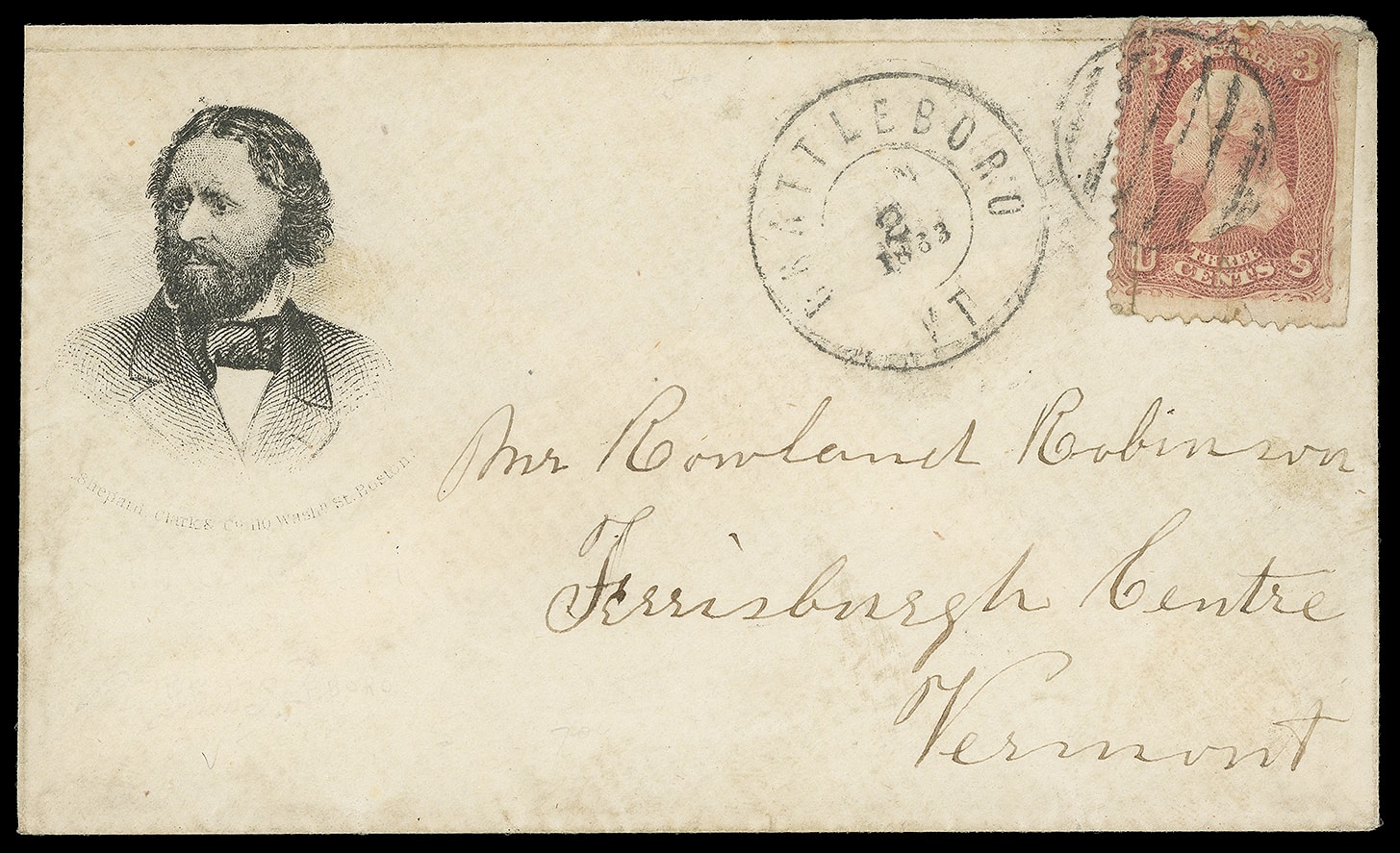 198     JF-21 image(1864 Campaign) John Fremont. Portrait campaign design with "Shepard Clark & Co. 110 Washington St. Boston Mass" imprint below, on small cover bearing 3¢ rose (65) tied by six-bar grid, matching "Brattleboro Vt. 1863" cds to Ferrisburgh Centre Vt.; some wear, 3¢ faults, F.-V.F. appearance.
