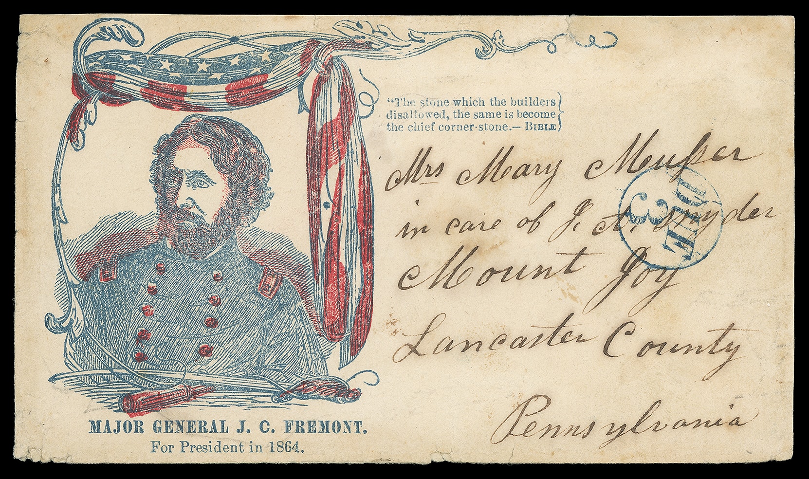 197     JF-64 image(1864 Campaign) John Fremont. Red and blue patriotic campaign design with "Major General J.C. Fremont For President in 1864" caption and verse on cover with Baltimore blue "Due 3" in circle rating handstamp to Mount Joy Pa.; cover edge flaws and light cleaning, F.-V.F. appearance, a scarce patriotic campaign design.