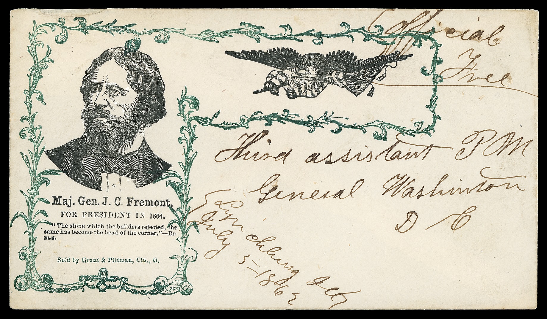 196     JF-62 image(1864 Campaign) John Fremont. Black portrait design with additional eagle and flags, "Maj. Gen. J.C. Fremont for President in 1864" caption, all in an intricate green frame on cover with manuscript "Lynchburg, Ill. July 5 - 1862" postmark and "Official Free" rating addressed to the Third Assistant Postmaster General, Washington D.C.; partial flap with small top left edge mend, Extremely Fine, ex-Gabriel.