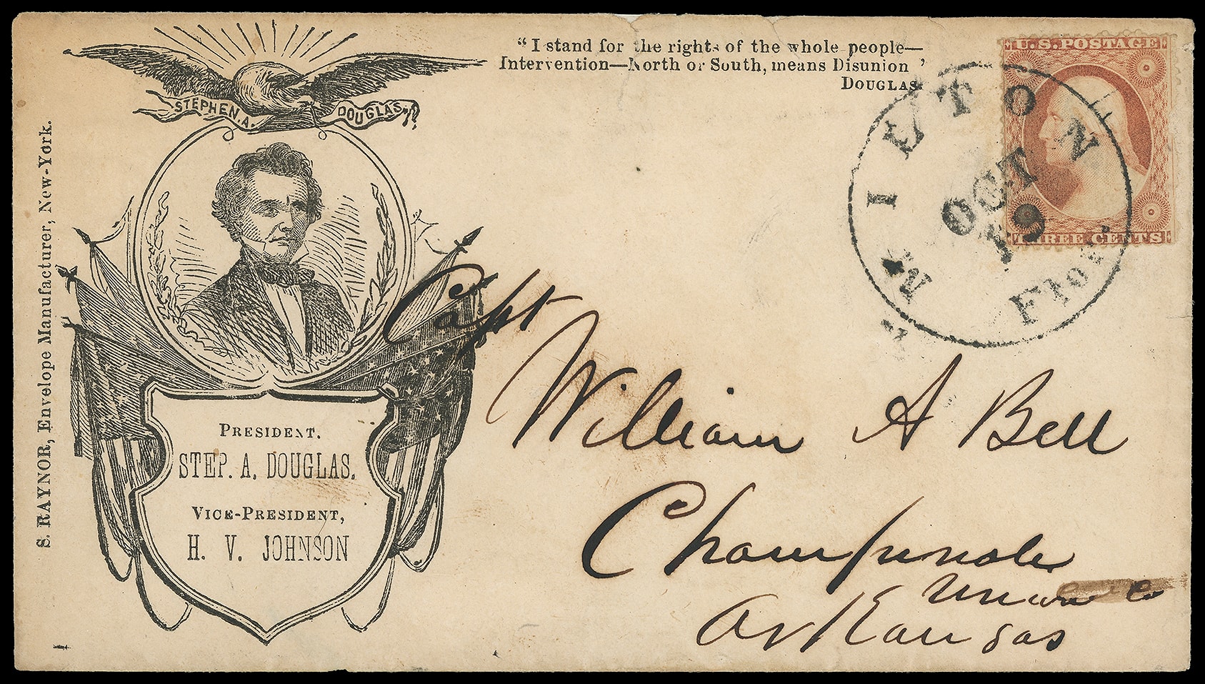 181     SD-39 image(1860 Campaign) "President Step. A. Douglas, Vice President H.V. Johnson". Oval Douglas portrait campaign patriotic design with Flags and Eagle surounding, verse "I stand for the right of the whole people" at right, on cover bearing 3¢ dull rose (26) tied by "Milton, Flor. Oct 19" cds to Capt. William A. Bell, Union County, Arkansas; couple top edge tears, flap mostly complete, F.-V.F. and scarce 1860 campaign envelope used from Florida.