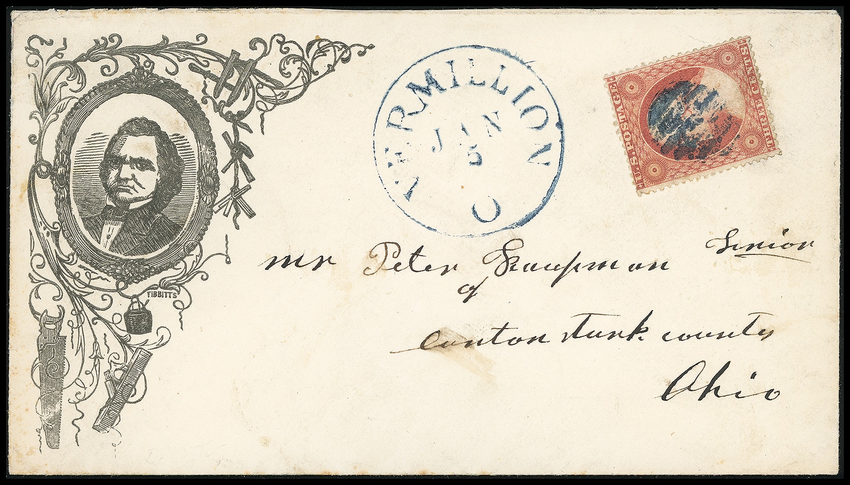 182     SD-40 image(1860 Campaign) Stephen A. Douglas. Oval portrait in ornate frame campaign design on cover bearing well centered 3¢ dull red (26) canceled by blue grid cancel, matching "Vermilion O. Jan 5" cds to Canton, Ohio, exceptionally attractive, Extremely Fine and choice.