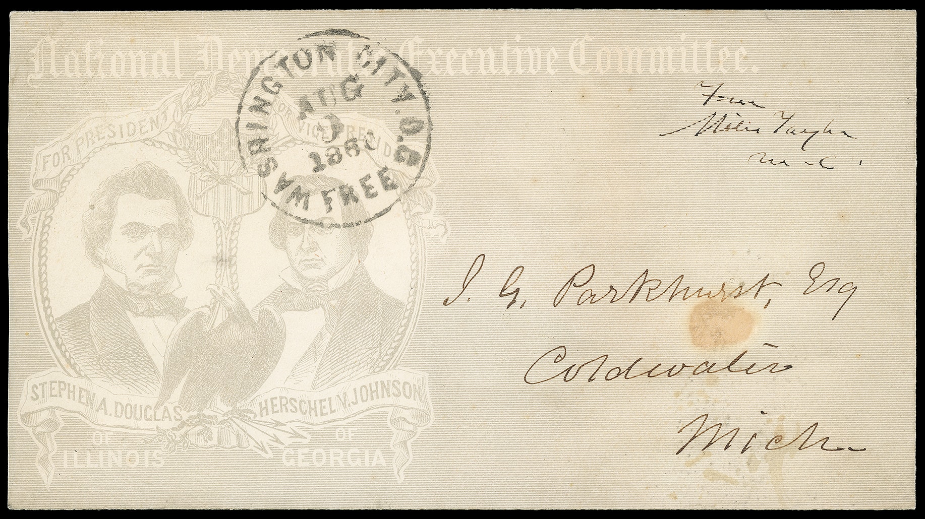 185     SD-43 image(1860 Campaign) Stephen A. Douglas, Herschel Johnson. Gray overall illustrated campaign design with dual oval portraits of S. Douglas and H. Johnson for the "National Democratic Executive Committee", Mospedon & Baker imprint on flap of cover with Chairman "Miles Taylor, M.C." Congressional free frank and neat "Washington City 'Free' Aug 9, 1860" cds to Coldwater Ill.; stain spot, otherwise Very Fine and extremely scarce, ex-Landau.
