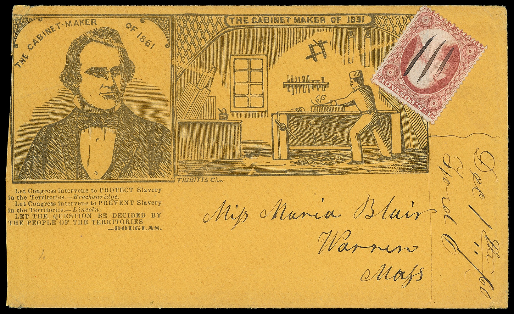 183     SD-41 image(1860 Campaign) Stephen Douglas "The Cabinet Maker of 1861". Large illustrated campaign design featuring portrait of Douglas facing right, verse below and illustration of cabinet maker at right, Tibbetts of Cleveland imprint, on orange cover bearing 3¢ dull red (26) manuscript canceled, matching ms. "Dec 1st "60, Flora O." postmark vertically at lower right to Warren Mass.; reduced at left, 3¢ corner crease, otherwise Very Fine and exceedingly rare design.