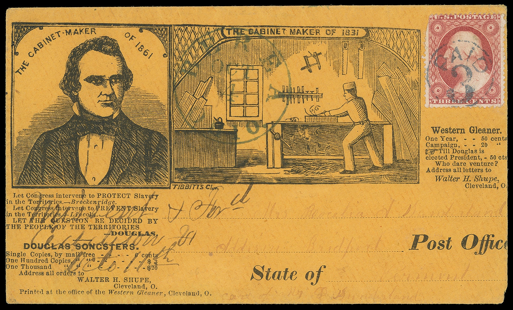 184     SD-42 image(1860 Campaign) Stephen Douglas "The Cabinet Maker of 1861". Large illustrated campaign design featuring portrait of Douglas facing right, verses below including "Douglas Songsters" and illustration of cabinet maker at right, Tibbitts and Western Gleaner of Cleveland imprints, on orange cover bearing 3¢ dull red (26) canceled by blue "Paid 3" in Circle cancel, matching "Berea, Ohio Oct 4" cds to Bridport Vt., missent and forwarded with manuscript "Missent & Ford, Addison Vt. Octo. 11th" postmark due to address mentioning Addison, which was the county; reduced slightly at right, 3¢ corner flaw, still Very Fine and wonderful campaign design.