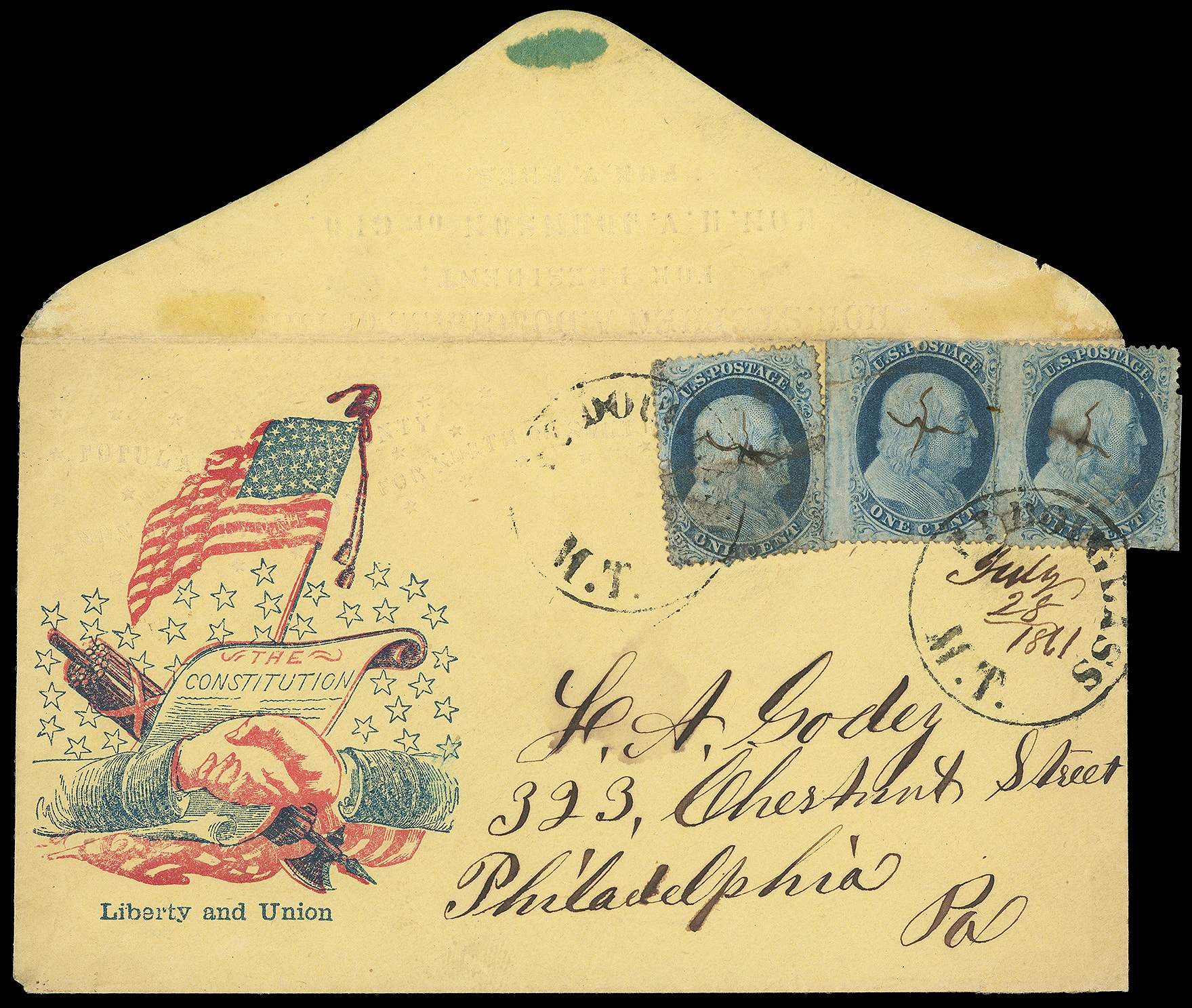 187     SD-48 image(1860 Campaign) Stephen A. Douglas, H.V. Johnson. Blind embossed campaign design on front and flap of patriotic cover with red and blue Flag, Constitution and Hands, additional verse "Liberty and Union" below, on yellow cover bearing three 1¢ blue (22 large break at top, 24, 24) singles, tied by two strikes of "Pt. Douglas M.T." cds, one with ms. "July 28, 1861" dating to Philadelphia Pa.; stamp faults, scarce combination and territorial usage, F.-V.F. appearance and scarce Minnesota Territory campaign use.