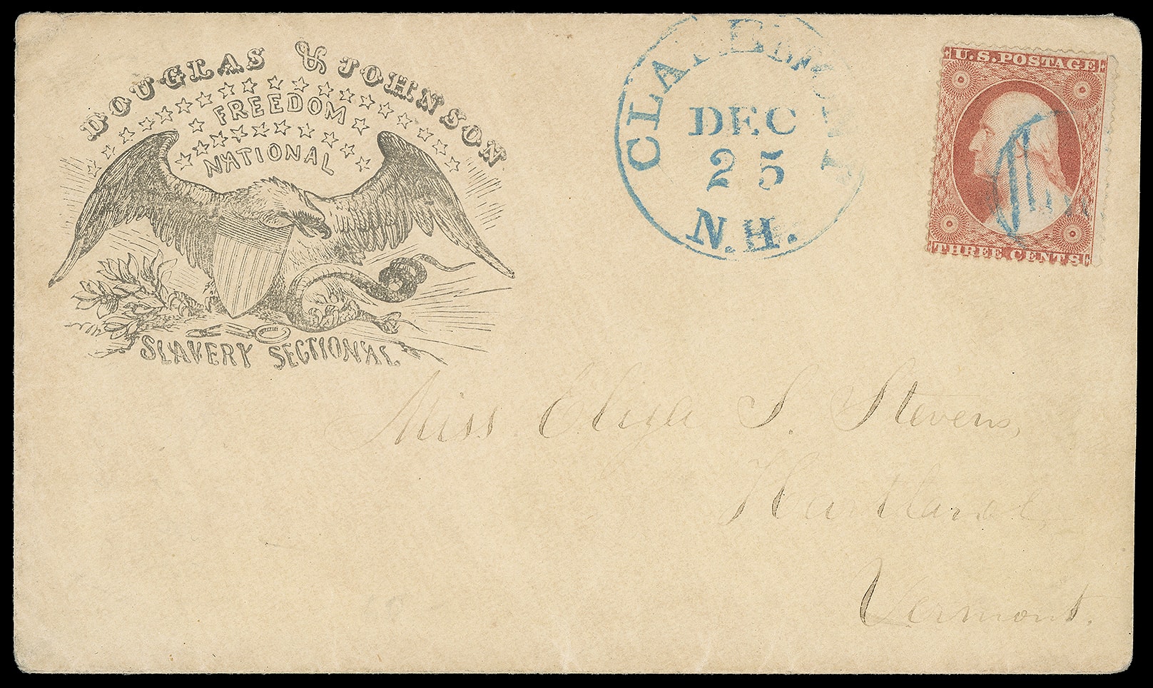 186     SD-46 image(1860 Campaign) Stephen A. Douglas, H.V. Johnson. Patriotic campaign design featuring Eagle, Shield and Serpent "Douglas & Johnson, Freedom, National, Slavery Sectional" slogans on fresh cover bearing 3¢ dull rose (26) canceled by partial blue circular grid, matching "Clarendon N.H. Dec 25" Christmas Day cds to Hartland, Vermont, Extremely Fine and choice, a rare design.