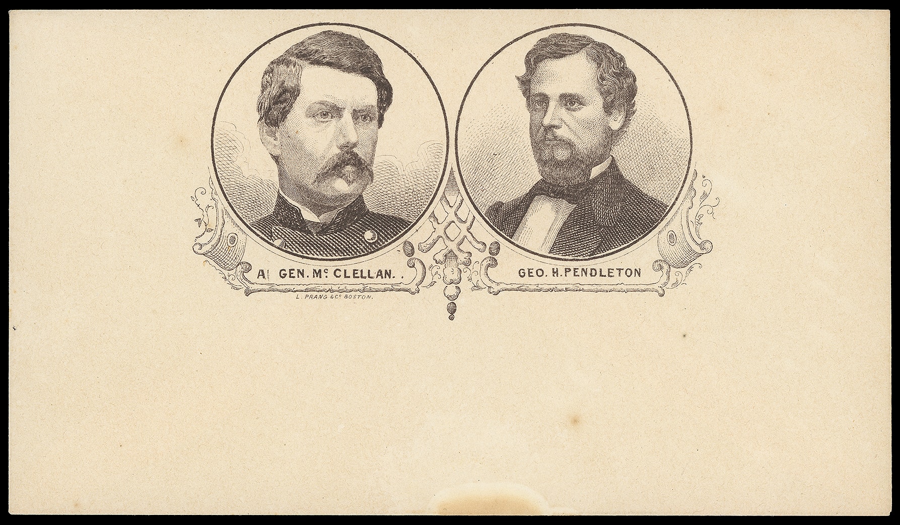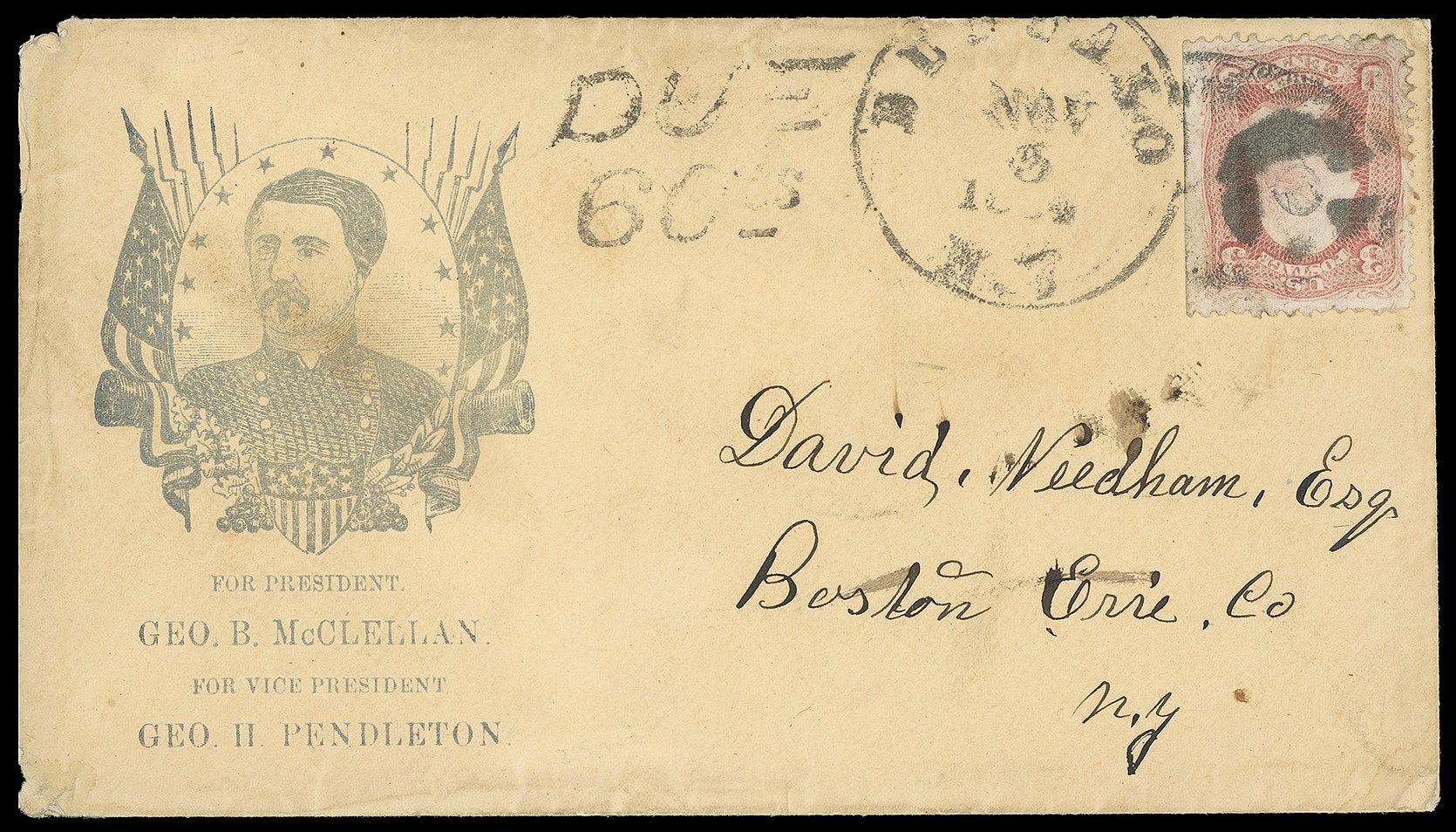 189     GM-2 Var image(1864 Campaign) George B. McClellan, George H. Pendleton. Gray patriotic campaign design featuring oval portrait surrounded by flags, cannons and shield, on amber cover bearing 3¢ rose (65) tied by patent punch cancel duplexed with "Buffalo N.Y. Nov 5, 1864" cds to Boston N.Y.; faint stain in oval, left corner wear; small edge flaws at left and light stain in oval still, F.-V.F.