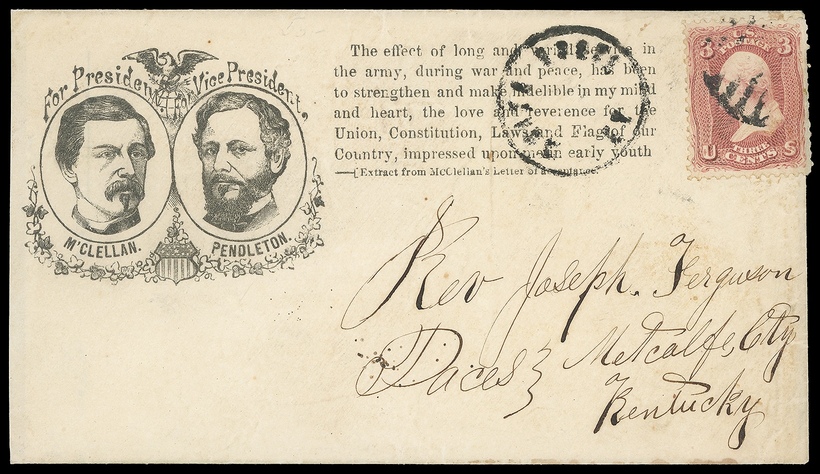 193     GM-9 image(1864 Campaign) George B. McClellan, George H. Pendleton. Dual portrait campaign design with ornate Patriotic frame showing eagle and shield, "Extracts from McClellan's letter of acceptance" verse at right on cover bearing 3¢ rose (65) barely tied by partial grid, matching indistinct Ky. town cds to Paces Ky.; 3¢ small flaws from overhang, Very Fine and rare campaign design.